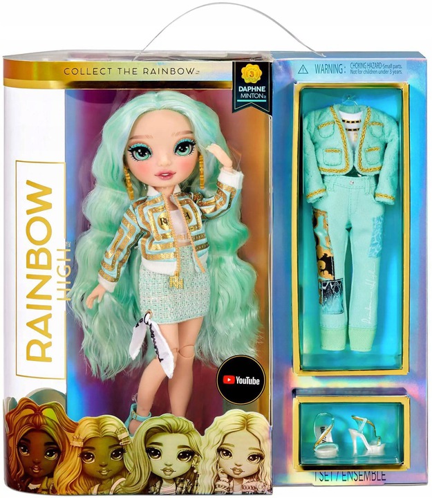 Daphne Minto ma unikalny design i jest ubrana w miętę od stóp do głów. Ma wspaniałe, szczegółowe rysy, piękne włosy, długie rzęsy i przepiękne oczy. Zbierz wszystkie wspaniałe lalki Rainbow High fashion. Daphne zawiera 2 kompletne stroje dla lalek z ubraniami, butami i akcesoriami dla lalek. Ubierz ją w każdy strój, a następnie połącz i dopasuj stroje i akcesoria, aby pobudzić wyobraźnię. Daphne koncentruje się na projektowaniu akcesoriów i uwielbia, aby jej wygląd był świeży i pełen dodatków. Przychodzi ubrana w stylową satynową kurtkę z nadrukiem graficznym, dzianinową bluzkę, tweedową spódnicę z chustą z organzy z sitodrukiem i szpilki z paskami. Jej drugi strój to dwuczęściowy, sztucznie pikowany, zamszowy t-shirt z grafiką i wysokie szpilki z paskami. Lalka jest w pełni ruchoma, jej ręce i nogi zginają się w wielu efektownych pozach by zaprezentować się między innymi na dołączonym stojaku dla lalek..